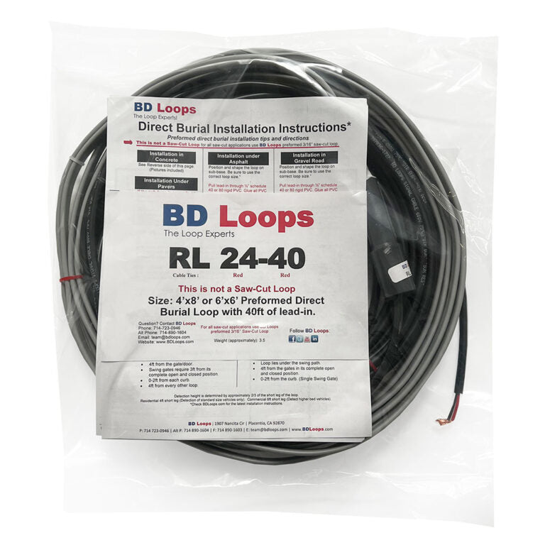 BD Loops Preformed Direct Burial Inductance Loops are a complete loop with a set size loop and length of lead-in run. Our Direct Burial Loops have an extra layer of protection: a durable outer jacket that protects and tightly binds the inner conductors. All BD Loops are made with 16 AWG copper wire and rated for direct burial use.